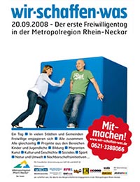 2008 gewinnt cct: werbeagentur den Pitch für die Großveranstaltung eines Freiwilligentages für die Metropolregion Rhein-Neckar. Neben der Entwicklung des Claims und der Wortmarke „Wir schaffen was“ und des gesamten visuellen Auftritts, war cct: werbeagentur als betreuende Agentur auch für Konzeption und Umsetzung nahezu aller Werbemaßnahmen verantwortlich. „Wir schaffen was“ bringt die doppelte Bedeutung der Veranstaltung auf den Punkt: zum einen wird etwas Bleibendes geschaffen, zum anderen wird dies mit Tatkraft erreicht, unter „Schaffen“ versteht man hier in der Region, besonderen Einsatz zu zeigen.